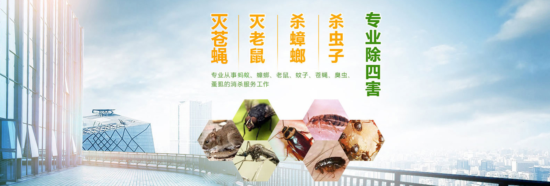 服務于為賓館飯店、餐飲業、食品加工業、建筑業、商場、超市、學校、工廠、醫院等單位和家庭提供鼠蟲害等有害生物防治。
